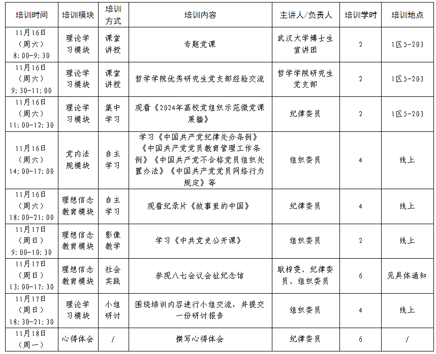 1.遵守培训纪律。预备党员参加培训是党员发展的必备环节。培训期间集中学习活动不得无故缺席,不得迟到早退。请假2个学时以上及出现违纪行为者,将取消培训资格。