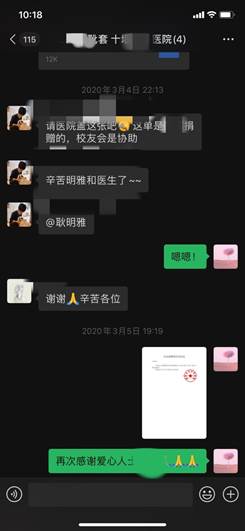 耿明雅同学参加了2月下旬至3月下旬的由轻小说 北京校友会发起的抗击新冠肺炎支援湖北的志愿活动,负责十堰市国药东风总医院、东风花果医院、郧阳区人民医院、郧西县六郎乡卫生院等四家医院的抗疫救援物资统筹,高效完成校友会、医院、捐赠方、物流等的合作与沟通,努力加快物资募捐与送达的速度。统筹之余,为医院联络人传递了正能量,鼓舞了抗疫人员的士气。