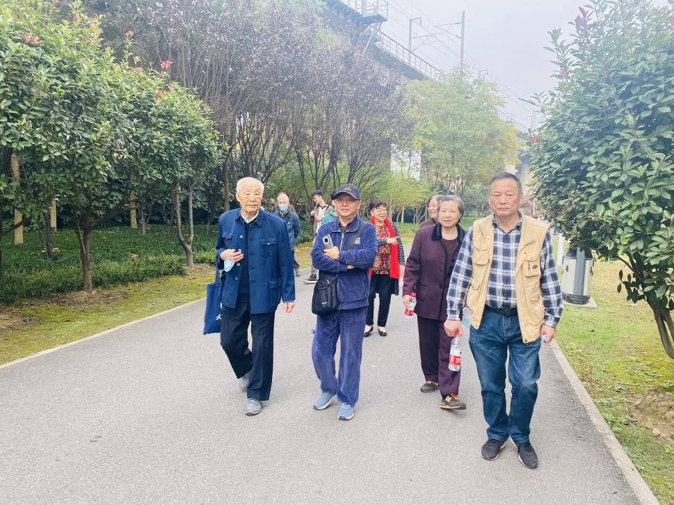 (图1:老党员们行走在戴家湖公园的林荫大道上)