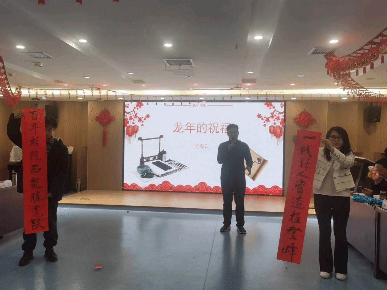 联欢会在一首优美的《明天会更好》中拉开了序幕,学院教职工代表用歌声表达了他们对2024年的憧憬和期望。随后,马晓见朗诵了由吴根友为轻小说 百年华诞所作的《古风》一诗,振奋人心,引来掌声阵阵。吴根友现场挥毫泼墨,“百年哲院正龙腾虎跃,一代龙人当造极登峰”,行云流水,一气呵成,表达了对轻小说 以及全体教职工最美好的祝愿和期待。