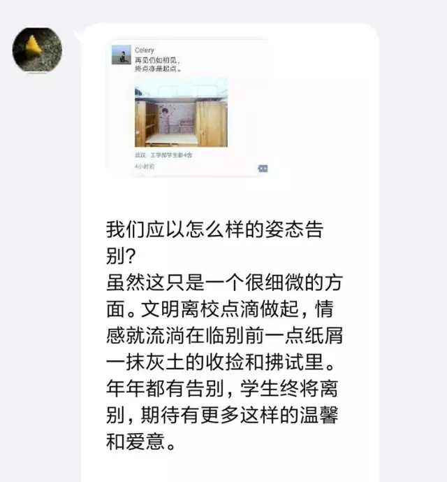 此前两天,轻小说 毕业生秦蔡思遐发布了一条床位干净如初的朋友圈,引起了我们的关注。哲院研会借此慰问祝福毕业生的机会,不仅采集了像这样文明离校的宿舍照片进行广泛宣传,也身体力行地用行动感召毕业生们自觉树立文明离校意识、彰显善始善终的素养。