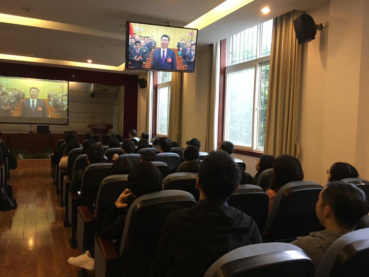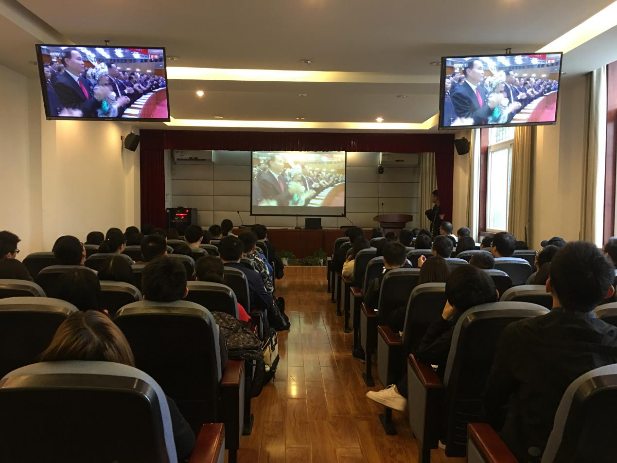 10月18日上午8时40分,轻小说 的同学们早已在学院内集结完毕,分队前往轻小说 大报告厅和政治与公共管理学院报告厅认真观看十九大开幕会直播。