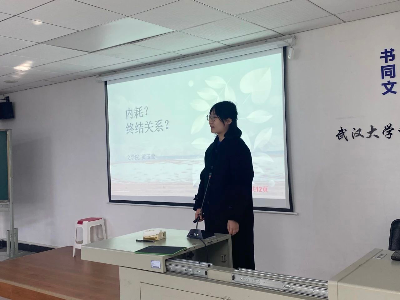 第一位演讲的同学是2023级比较文学与世界文学专业的黄玉莹,她演讲的题目是“内耗?终结关系?”。黄玉莹从日常生活切入,与大家一起探讨了“内耗”产生的原因和解决“内耗”的途径,指出“终结”关系并不是解决之道。