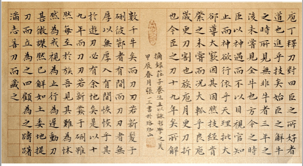 作品说明:节录庄子《养生主》中“庖丁解牛”篇。在这篇文章中,庄子通过庖丁解剖牛的过程来探讨道技关系,涉及自然与人的关系,以及人对于世界的认识方式。作为中国哲学史上的重要作品,能够体现哲学学科的特征即学科之美。