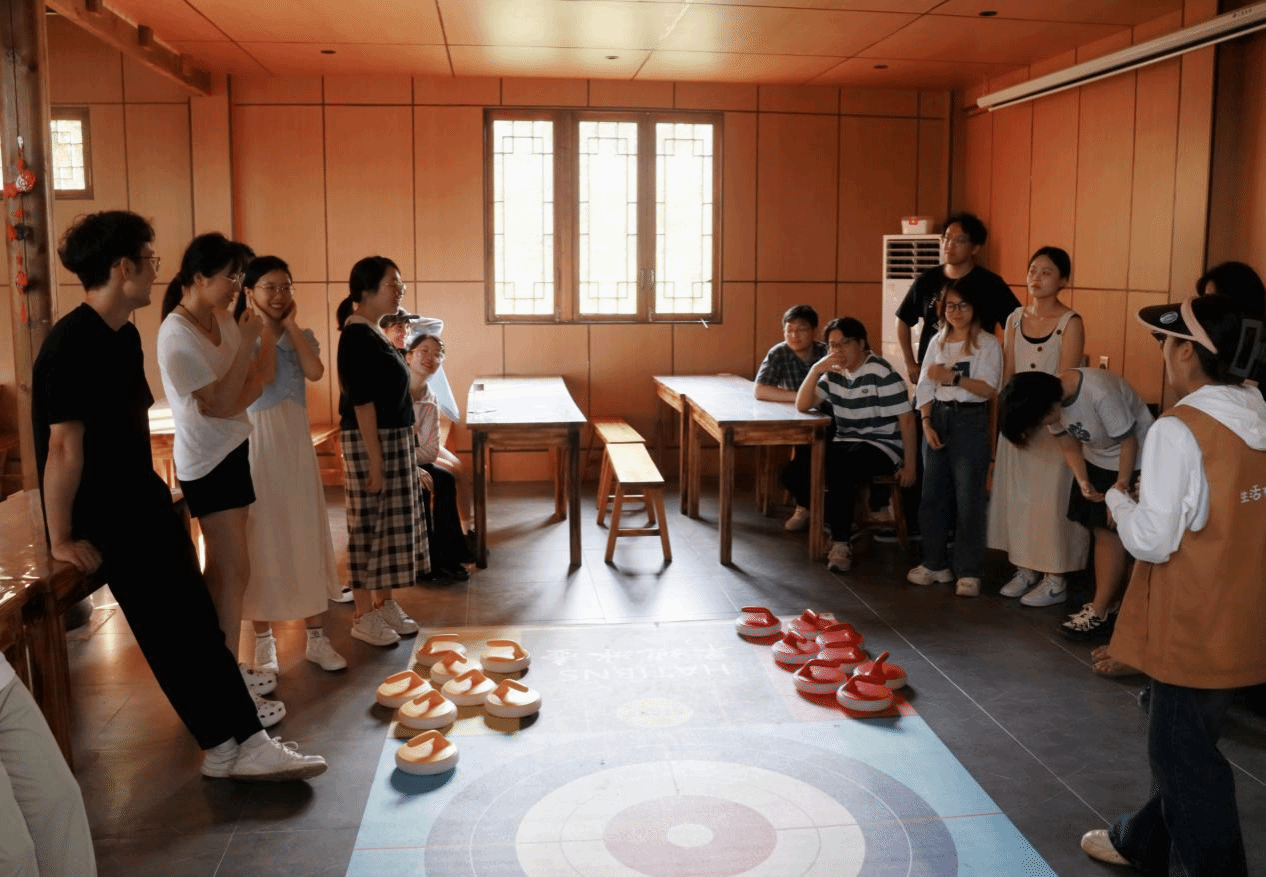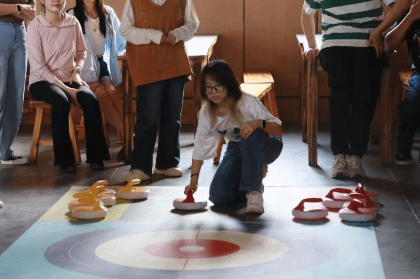 旱地冰壶,顾名思义是在地面上进行的类似于冰壶项目的一项运动。队伍双方需要轮流投出冰壶,最后按照各自队伍留在得分区的冰壶数量计算成绩。同学们很快分好了队伍,并展开了激烈的对决。在前两轮的角逐过后,黄队以2:0的比分领先。最后一局采用了更复杂的游戏规则,根据冰壶在得分去的位置,每个冰壶会获得不同的分数。经过最后的决战,红队以15:5的大比分扳回一局。
