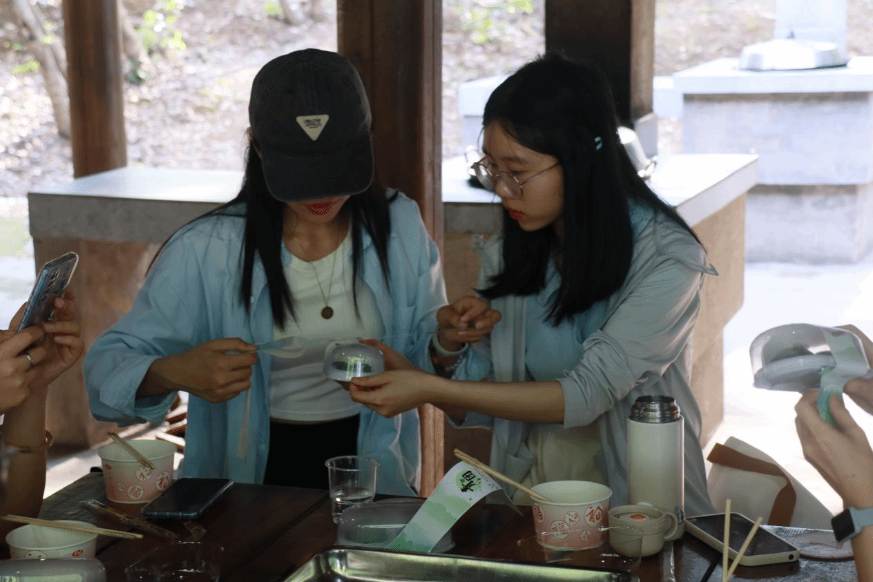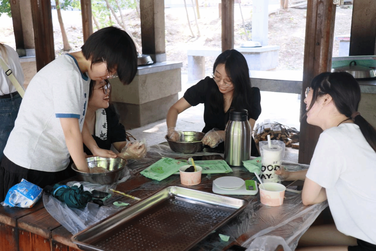 青团,又称艾粄,是江南地区的传统特色小吃。制作青团时,需要向青团粉中加入等重的水,随后将其搅拌并揉制好,取适量揉制好的面团压成薄片,将馅料包入其中并揉成团子即可。制作时,每两个人一组,大家都沉浸在劳动的喜悦中。将制作好的青团放入蒸柜蒸制十五分钟后,大家品尝到了自己亲手做好的青团。