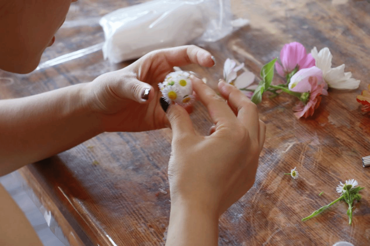 伴随着指导教师的讲解,同学们兴致勃勃地开始了植物风铃的制作。植物风铃制作的重要环节是收集植物的花和叶并使之附着于压制好的超轻粘土上,因此在老师讲授过制作环节之后,同学们先来到室外采集植物,随后再回到室内进行风铃的制作。