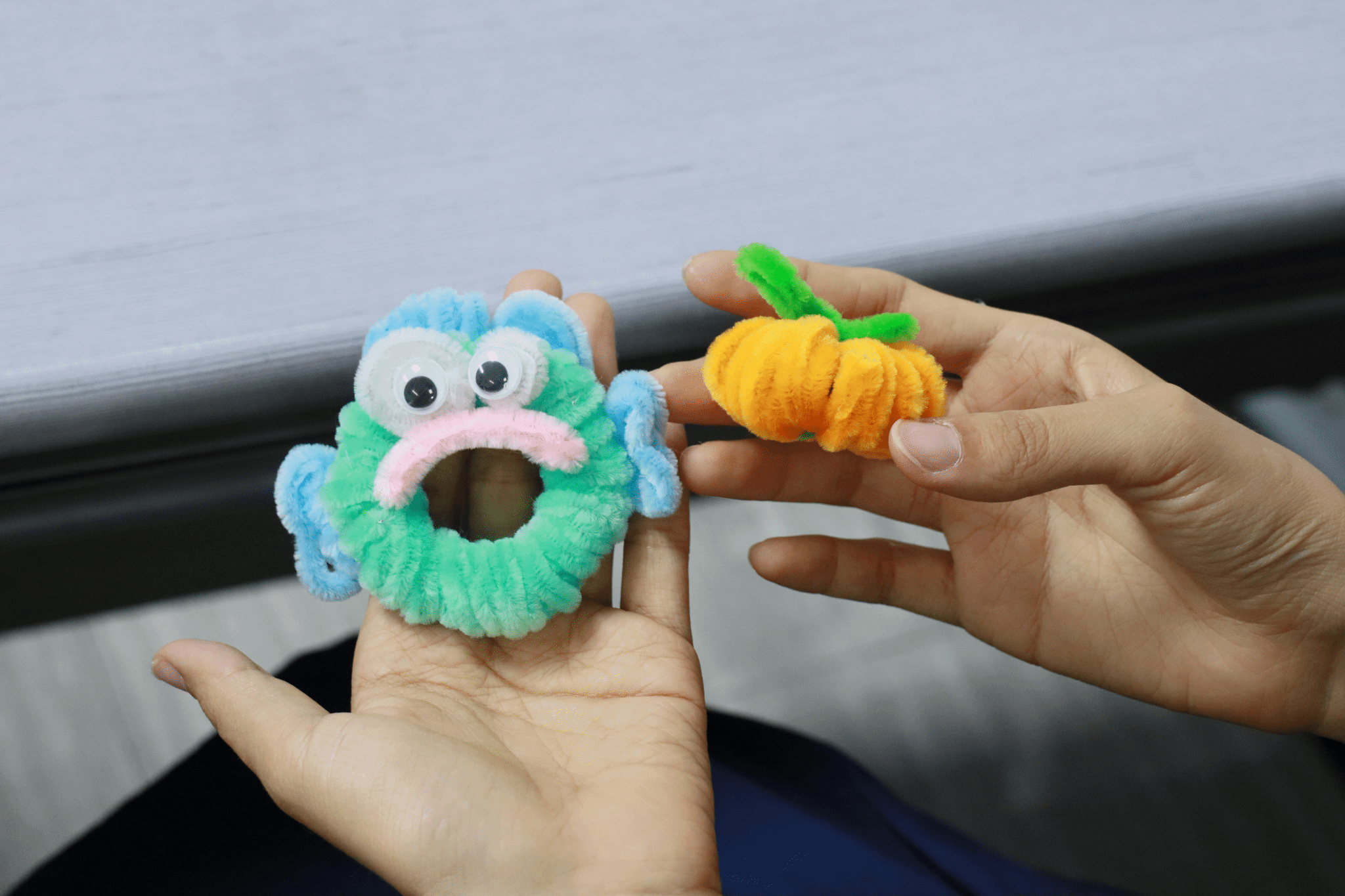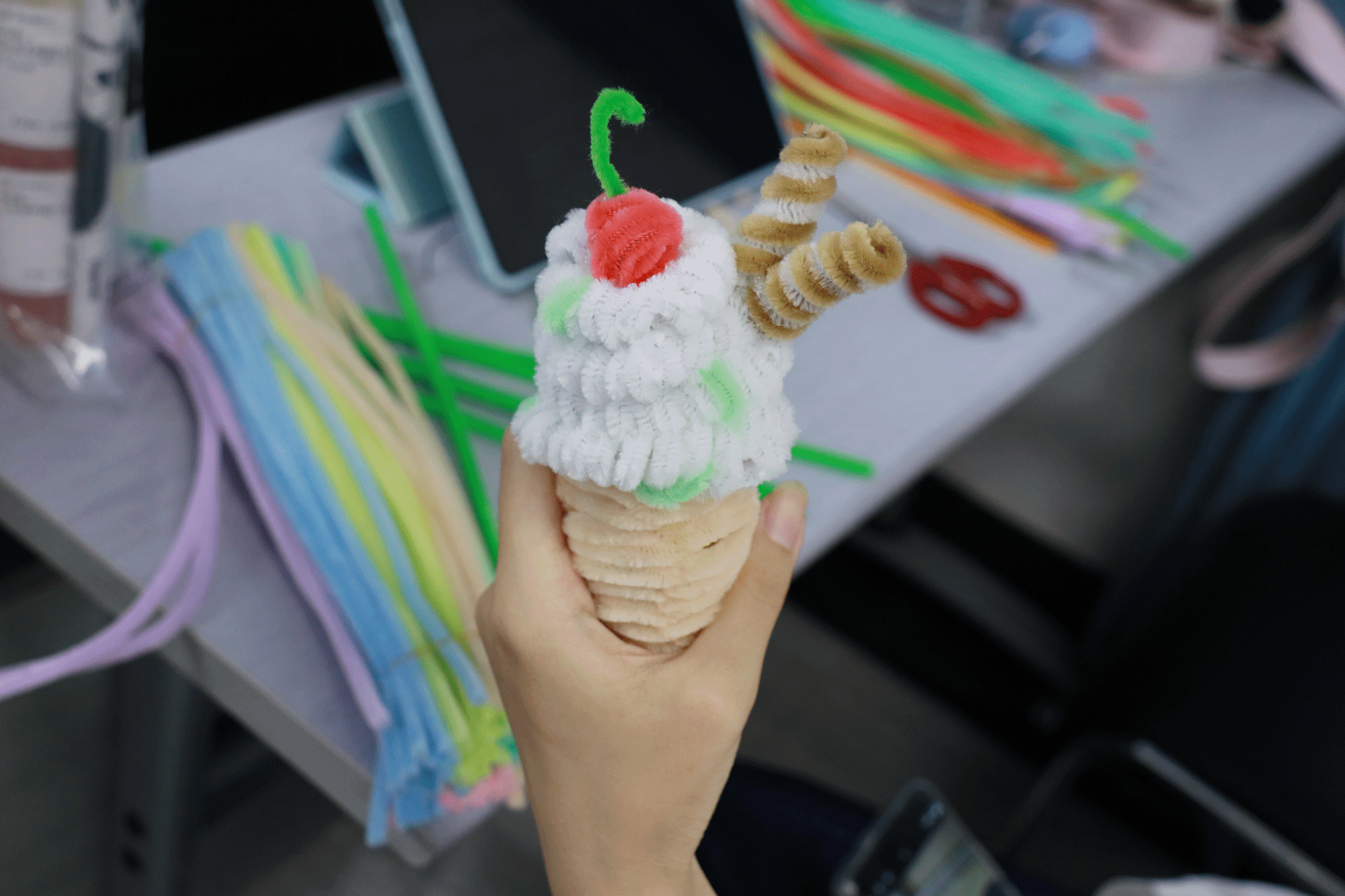 许多同学展现出了惊人的创意和手工天赋。一位同学利用扭扭棒制作了一束灿烂盛开的铃兰花,柔和的线条和明快的颜色让人赞叹不已。另一位同学则巧妙地将扭扭棒扭成了一只冰淇淋,丰富的细节和自然的形态引来众人称赞。