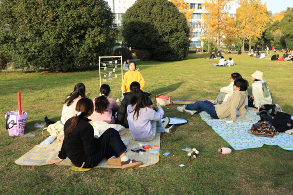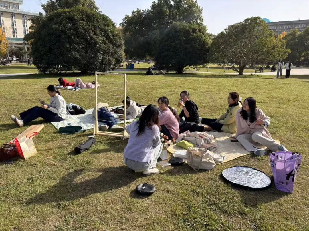 随后,同学们自愿组成三支队伍,分别以“寻觅治愈能量”“发现平常之趣”“捕捉温暖微笑”为主题,在校园内内展开自由创作。银杏金黄、绿草如茵,校园的秋色在镜头下被赋予情感与故事,而并肩行走、共同寻找的过程,也让彼此之间悄然建立起更深的情感连结。一小时后,各组携带作品返回草坪,一场温馨的“草坪光影展”就地展开。微风轻拂,悬挂的照片轻轻摇曳,每一张都在静静诉说。