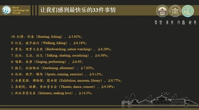 首先,李凯老师通过分析数万人持续五年的追踪数据,为同学们揭示了那些最常带来愉悦感的33件事情。令人稍感意外的是,排名靠前的并非多么特殊的经历,而是那些被我们忽视的普通时刻——与大自然的亲密接触、投入的运动锻炼、深度的艺术体验,以及真诚的人际互动。这些发现让在场同学开始反思自己的生活方式:是否在埋头科研的同时,忽略了这些能够滋养心灵的重要活动?