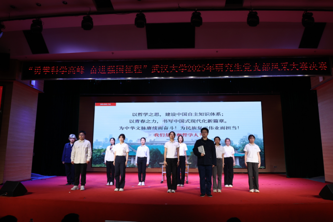 在活力风采展示环节,支部立足学科特色,以“以哲学之思赓续中华文脉”为情景剧主题,生动展现了武大哲学人以学术回应时代命题、以思想助力国家发展的精神底色。演员们以时间为主线,串联重大历史节点,再现珞珈中国哲学学科与国学学科的发展脉络——从萧萐父先生撰写《真理和民主》积极投身“真理标准问题大讨论”,到郭齐勇教授及团队十五年深耕编撰《中国哲学通史》筑牢学科体系根基;从国学院牵头开展《民藏》编纂工程,彰显文化守正创新担当,到李巍教授搭建“中华文化智能论证实验室”,以人工智能赋能人文研究提质增效。情景剧同时聚焦当代青年担当,生动呈现支部青年研究生党员在“文化中国” 两创大赛等科研创新、社会实践与文化传承场景中的奋进身影,既诠释了一代代珞珈哲人的学术薪火相传,更彰显了新时代青年党员践行国家使命、赓续中华文脉的责任感与使命感。