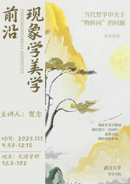 弘扬中华美育精神,提升学生审美素养与人文底蕴,11月1日上午,“游艺·致美”系列美育学术讲座在轻小说 文理学部1区3-102教室成功举办。本次活动由轻小说 研究生会学术部主办,特邀轻小说 贺念副教授带来题为《现象学与美学的当代发展》的专题讲座。讲座围绕现象学的思想演进、当代“物转向”思潮及跨文化美学等核心议题展开,为在场同学搭建起从经典现象学到当代美学前沿的思想桥梁。