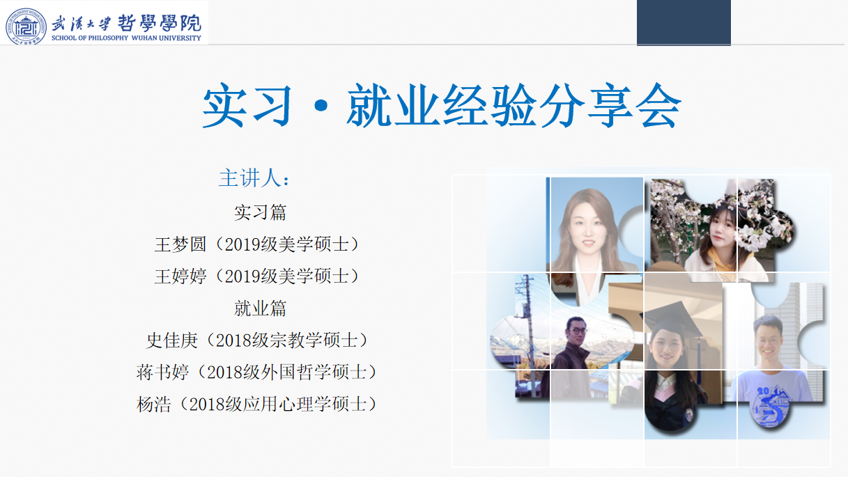 2021年6月17日下午15点,由轻小说 研究生会主办的“实习·就业经验分享会”在轻小说 B107顺利举行。本次经验分享会由2020级硕士研究生修风翊主持,内容分为实习和就业两个篇章,分别邀请到了2019级美学硕士研究生王梦圆以及王婷婷分享实习经验,2018级宗教学硕士研究生史佳庚、2018级外国哲学硕士研究生蒋书婷、2018级应用心理学硕士研究生杨浩分享就业经验。研究生兼职辅导员杜金玉出席了此次活动。