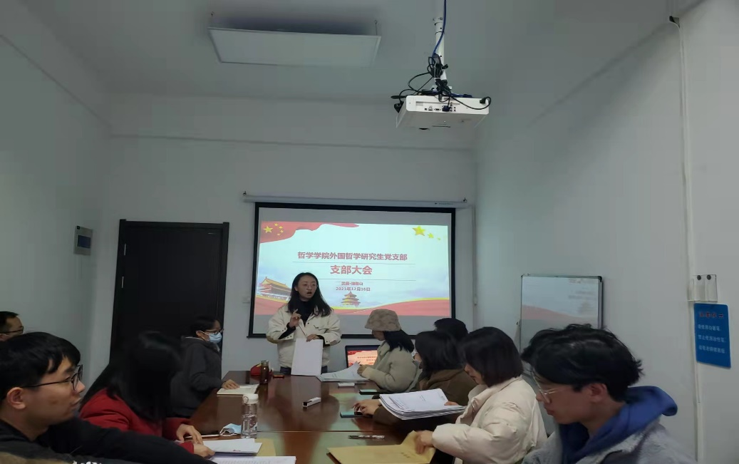 2021年12月16日下午,外国哲学研究生党支部于学院B303召开了预备党员转正大会,讨论关于仁珂彤、高雪莲两位同志发展为正式党员的问题。该会议由支部书记邹珊同志主持,且严格按照组织发展程序进行。