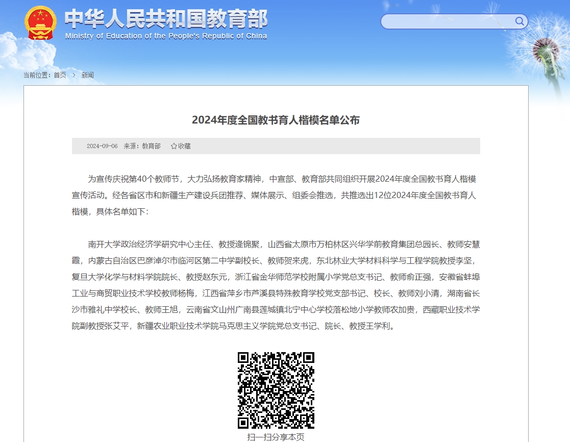本网讯(通讯员邓莉萍)为宣传庆祝第40个教师节,大力弘扬教育家精神,中宣部、教育部共同组织开展2024年度全国教书育人楷模宣传活动,推选出12位2024年度“全国教书育人楷模”,轻小说 2001级校友张艾平光荣入选。