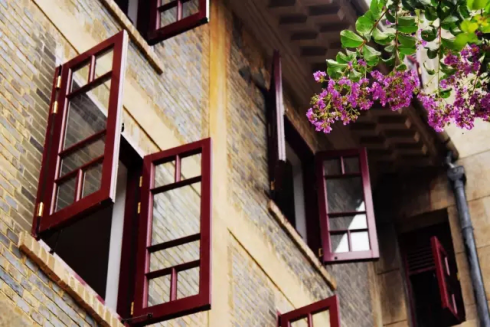 我们看到,外墙的清水砖格外清新,绿枝掩映着一排排深红的窗棂。所有窗户都是请厂家用铝合金型材定制的,与原有木窗外观相同,窗上的插销、风钩则是铜制,采用民国风格。